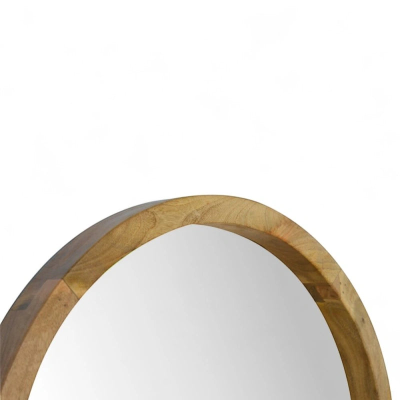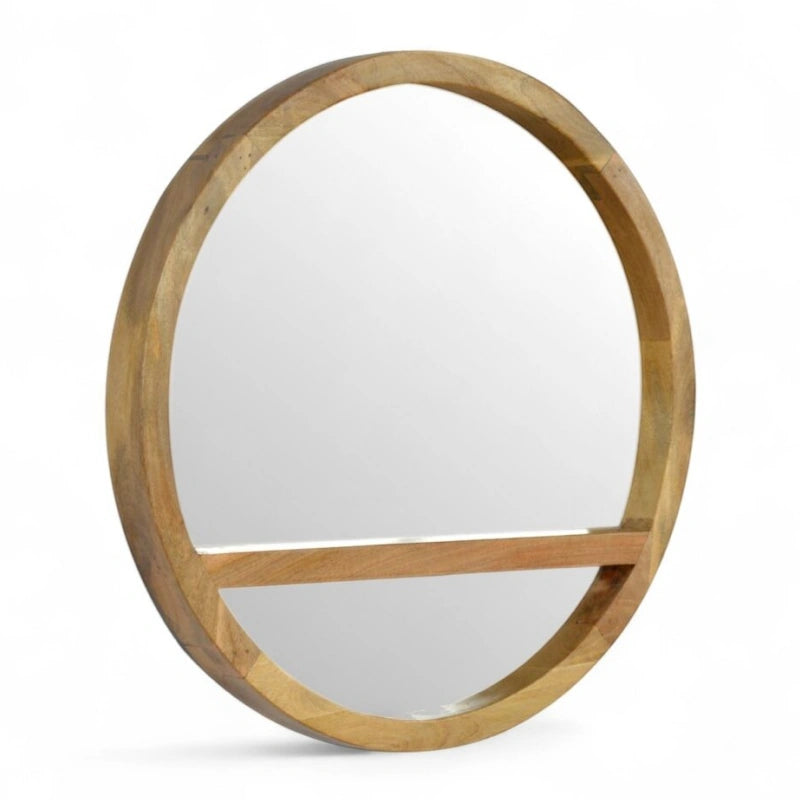 Both functional and decorative, this wooden round wall mirror with shelf is the perfect accent for any space. Handcrafted from solid mango wood, it features a circular mirror framed in natural wood with a built-in shelf for displaying small décor, candles, or everyday essentials.